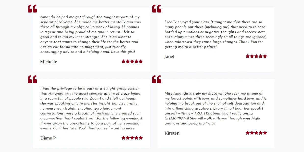 "I worked with Amanda years ago in my weight-loss journey of 55lbs in one year. I have reached out to her again as I have strayed off my path and need to be real in my life mentally, physically, emotionally and spiritually. In her confidential, safe environment I now have had a past life reading and healing. It made me really question things I am doing in the present and maybe there is a hidden reason I do things that I have brought with me to this life, right now. It got me thinking about what I need to do to get in a better headspace about everything and also work with Amanda for guidance as we move forward as we did a reset and ready for the past to be the past and move forward with her motivation, rawness for self awareness and her kindness when needed. I was holding onto some really dark stuff, now it’s cleared and moving onto bigger and better things in life, seeing things in a different light since my clearing. --
